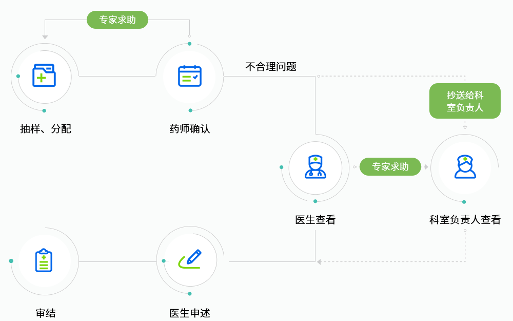 系統可實現從抽樣、分配、求助、專家復核、反饋醫生、醫生申述到藥師審結的點評閉環管理,幫助醫院逐步提高用藥水平。
