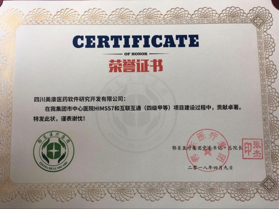 在美康公司的現(xiàn)場協(xié)助和不懈努力下,黃石市中心醫(yī)院順利通過HIMSS EMRAM7級評審,并順利完成國家衛(wèi)計委醫(yī)院信息互聯(lián)互通標(biāo)準(zhǔn)化成熟度測評(四級甲等)現(xiàn)場查驗工作。為充分表彰四川美康在項目建設(shè)中做出的卓著貢獻,2018年4月9日,黃石市中心醫(yī)院特向四川美康公司頒發(fā)了榮譽證書。